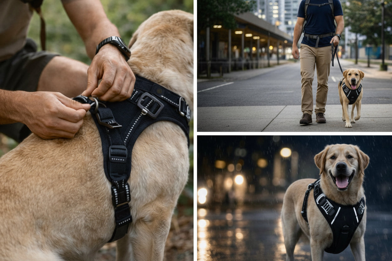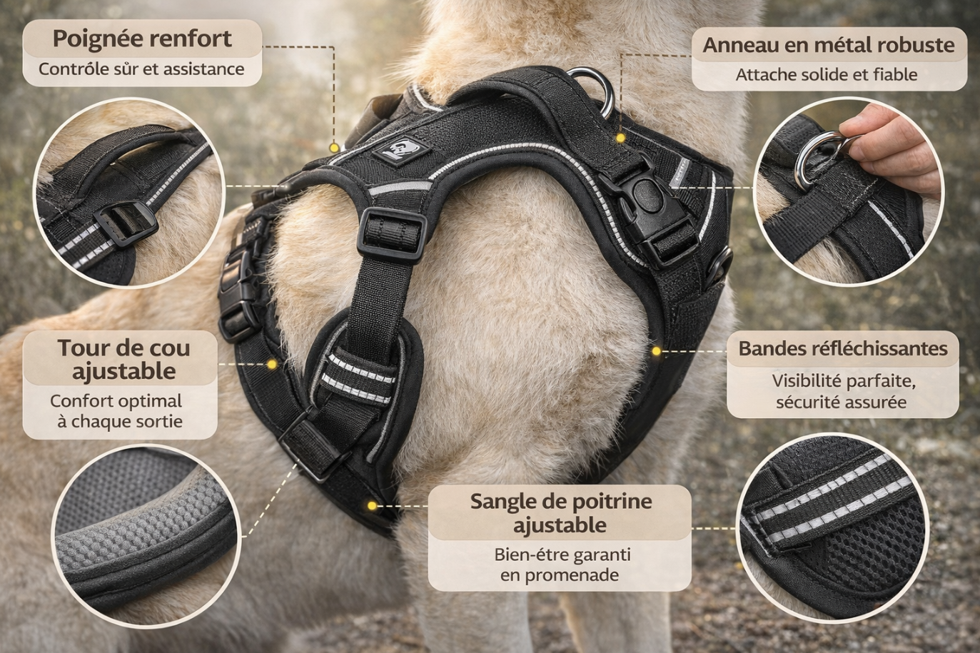 🐾 Quand votre chien tire, la traction se fait à l’avant du harnais — jamais sur la gorge.